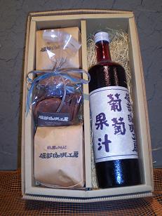| ブレンドコーヒーと葡萄果汁の詰合せ 香りのためのぶれんど 150g 酸と酷のぶれんど 150g 葡萄果汁 720ml アーモンドクッキー 1つ 4,000 円+税 |